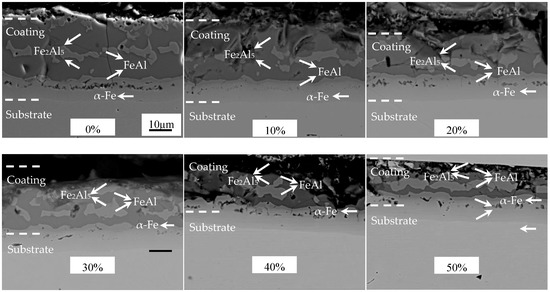 The cold-rolled coatings after austenitization were displayed in Figure 10. The structures of the coatings were significantly changed after austenitization. The austenitized AS60/60 coatings were structurally continuous and stratified with clear boundaries. The coatings at different positions were analyzed with EDS (Table 3). After the coatings cold-rolled at different reduction ratios were austenitized, the coating structures were consistent. Namely, the structures of the austenitized coatings did not change with the cold rolling reduction ratio. Each coating, from the surface to the steel substrate, consisted of a Fe2Al5 layer, a FeAl layer, a Fe2Al5 layer, a FeAl layer, and a α-Fe layer [17]. The Fe2Al5 layer, the FeAl layer, and the Fe2Al5 layer are called Al-Fe layers, and the FeAl layer and the α-Fe layer are called diffusion layer. The formation of the α-Fe layer is mainly attributed to the ability of element Al to stabilize the body centered cubic (BCC) structure of Fe.