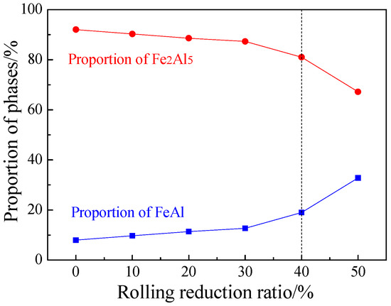 The area proportions of the Fe2Al5 phase and the FeAl phase in the Al-Fe layer after austenitization at different cold rolling reduction ratios were shown in Figure 11. As the cold rolling reduction ratio increased, the proportion of Fe2Al5 gradually decreased, but the proportion of FeAl rose. As the cold rolling reduction ratio rose, the coatings became thinner, improving the heating efficiency of PHS during austenitization, so the coatings melted more quickly, and there was sufficient time for the Fe element in the substrate to diffuse to the coatings. In the meantime, the thinning of coatings shortened the Fe diffusion distance to the coatings, which decreased the proportion of Al-rich Fe2Al5 and increased the proportion of Fe-rich FeAl. The cold-rolled coatings at reduction ratio ≥40% contained rapid diffusion channels, which enlarged the direct contact area between the steel substrate and the Al layer, so Fe can more directly and quickly diffuse to the Al layer, promoting the transition from Al-rich Fe2Al5 to Fe-rich FeAl and further increasing the proportion of FeAl.