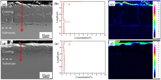 EPMA of interface between the AS60/60 coating and the steel substrate at TAUS = 930 °C for 5 min: (a,d) AS60/60 coatings at 0% and 50% reduction ratio, respectively, and (b,e) the corresponding EDS line scan results obtained along the red arrow; (c,f) EDS map scan results of oxygen element at 0% and 50% reduction ratio, respectively.