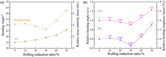 (a) Bending angle and Kx at different reduction ratios at TAUS = 930 °C for 5 min; (b) αx and Tx at different reduction ratios at TAUS = 930 °C for 5 min.