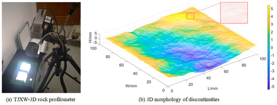 Different from intact rocks, the complex surface properties of rock discontinuities control the mechanical behavior of rock discontinuities. Previous research studies have shown that the morphological properties of rock discontinuities are one of the important factors which remarkably affect the strength and deformation characteristics of rock discontinuities under creep conditions [14,15,16,17]. The rock joint roughness coefficient (JRC) proposed by Barton and Choubey [18] has been recommended by the International Society for Rock Mechanics and Engineering to evaluate morphological characteristics of rock discontinuities. Zhang et al. [19] and Wang et al. [10] prepared samples of artificial discontinuities based on JRC and analyzed the impact of discontinuity roughness on creep characteristics. In recent years, the development of surface measurement technology has introduced new methods to describe 3D morphological properties of rock discontinuities with new morphological parameters [20,21,22]. However, the investigations related to the shear creep testing of rock continuities with 3D morphologies are limited.