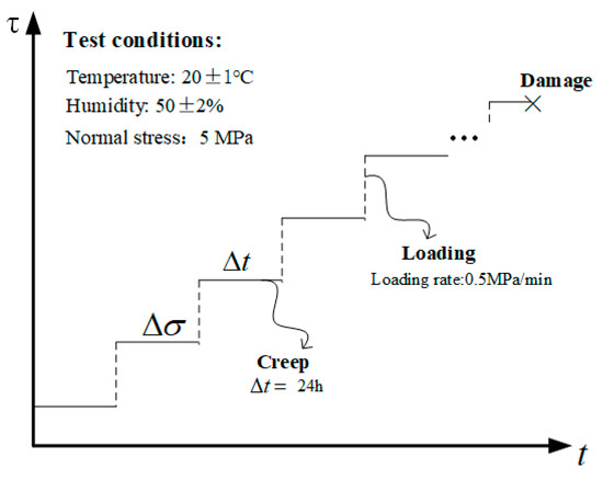 The basic mechanical parameters of rock mass discontinuities are determined through relevant basic mechanical tests. The average uniaxial compressive strength () was obtained as 50.5 MPa through the uniaxial ultimate compressive strength test. The average shear strength obtained by the direct shear test under a normal stress of 5 MPa (0.1) was 4.32 MPa. The shear creep tests are used to study the rheological characteristics of the discontinuities. Considering the design size of the testing machine, the size of the discontinuities is 100 mm × 100 mm × 100 mm (L × W × H). In this study, the normal stress of 5 MPa was applied and the shear rate maintained a constant rate of 0.5 MPa/min until the sample failed. The samples were sheared consecutively under six shear stress levels which are approximately 50%, 60%, 70%, 80%, 90%, and 100% of the shear strength (4.32 MPa), as shown in the Table 1. The duration of each stress level was set 24 h. If the sample did not damage at 100% of the shear strength, the shear stress would be increased to a higher level with the same increment until the sample damaged. The shear stresses and the last stress level are listed in Table 1. During the whole test process, the temperature was controlled at 20 ± 1 °C, and the humidity was controlled at 50 ± 2% to minimize any effects of temperature and moisture fluctuations on the test results. Figure 5 shows the relationship between shear stress and time under the shear creep test.