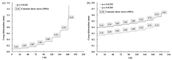 Figure 7 shows the grading creep curves of the discontinuities under various shear stress levels. The creep deformation increased slightly when the stress level was low at previous levels, while the creep deformation significantly increased under high stress levels, as shown in Figure 7a,c,d. Similar to the characteristics of the creep curve of rock, the shear creep curves of the discontinuities can be divided into three creep stages, i.e., transition creep stage, steady creep stage, and accelerated creep stage. Actually, due to the uncertainty of failure time, it was difficult to observe the three creep stages in the creep curve of the last stress level in many tests. In this study, only the creep curve at the last stress level of p-c-1 exhibited three creep stages (Figure 7b), while the samples in p-c-2 and p-c-3 failed rapidly at the last stress level. The creep curves at the last stress level of p-c-2 and p-c-3 can be considered to show that the accelerated creep stage occurred directly and the samples failed rapidly due to the absence of the transition creep stage and the steady creep stage.