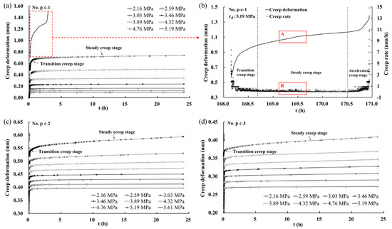 Figure 8 shows the creep rate of the whole process under the normal stress of 5 MPa, where the creep rate is the ratio of creep deformation increment to time increment (vD = ΔD/Δt). The creep rate slowly increased as the shear stress increased in previous loading steps, and when the shear stress level exceeded a certain value, the creep rate increased significantly. For example, the initial creep rate of p-c-1 was almost constant in the previous five shear stress levels and then increased suddenly when the shear stress was 4.32 MPa (Figure 8a). The initial shear creep rate under the shear stress of 4.32 MPa was 1.68 times higher than that when the shear stress was 3.89 MPa. For the samples of p-c-2 and p-c-3, the initial shear creep rate displayed an abrupt increase when the shear stress was 3.89 MPa, as shown in Figure 8b,c.