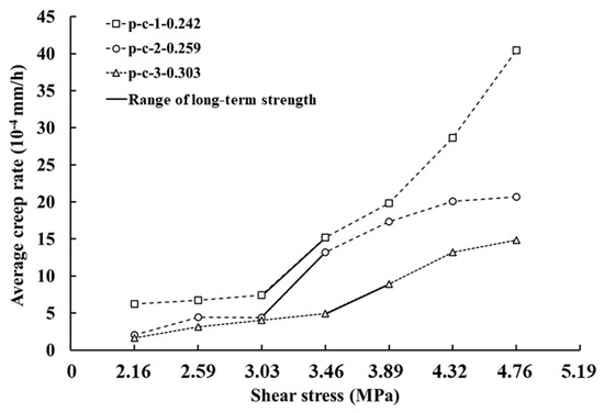 According to the analysis of the whole-process curve characteristics, the discontinuities showed steady creep until 8–24 h after loading, where the creep rate was approximately linear. Thus, the steady creep rate was taken from the average of creep rate within 8–24 h, regarded as average creep rate. Figure 9 shows the relationships between the average creep rate and shear stress in the shear creep tests. It can be observed that as the 3D morphological parameter () increased, the average creep rate of each shear stress level decreased. In addition, there was a threshold stress level in all shear creep tests. Taking p-c-1 as an example, when the shear stress was lower than 3.03 MPa, the average creep rates basically remained at the same level, which was 6.25 × 10−4, 6.74 × 10−4 and 7.40 × 10−4 mm/h, respectively. However, when the shear stress surpassed 3.03 MPa, the average creep rate increased greatly from 7.4 × 10−4 to 15.2 × 10−4 mm/h, as the shear stress increased from 3.03 to 3.46 MPa. Similarly, the average creep rates of p-c-2 and p-c-3 also showed a substantial increase if the shear stress exceeded a critical stress level. Therefore, it can be preliminarily determined that the critical value of p-c-1 and p-c-2 may range from 3.03 MPa to 3.46 MPa, while that of p-c-3 may range from 3.46 MPa to 3.89 MPa. The reason should be related to the expansion of cracks or non-linear growth of the viscoplastic strain rate in the creep process [26].