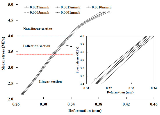 Actually, the steady creep stage and accelerated creep stage appear only when the stress is greater than the long-term strength. According to the inflection point method proposed by Wang et al. [12], each time point of the creep curve corresponds to a unique deformation and creep rate under a shear stress level. As a result, when a specific point in time is determined, the corresponding creep deformation, creep rate, and stress levels can be obtained. Finally, the iso-creep rate curves can be drawn in the stress–deformation coordinate system, as shown in Figure 10. Taking the sample of p-c-3 as an example, all the curves can be divided into linear and non-linear sections by an inflection point (Figure 10). When the stress is less than 3.5 MPa, the curves show a linear relationship, and then become non-linear with an inflection point when the shear stress is higher than 3.5 MPa. The inflection point is considered as a threshold at which viscoplastic deformation accounts for a dominant part of creep deformation. When the stress is higher than that at the inflection point and continues to increase, the viscoplastic deformation will increase greatly, and the non-linear feature of the curves is more obvious. Therefore, the stress value corresponding to the inflection point can be determined as the long-term strength in the shear creep tests of rock discontinuities.