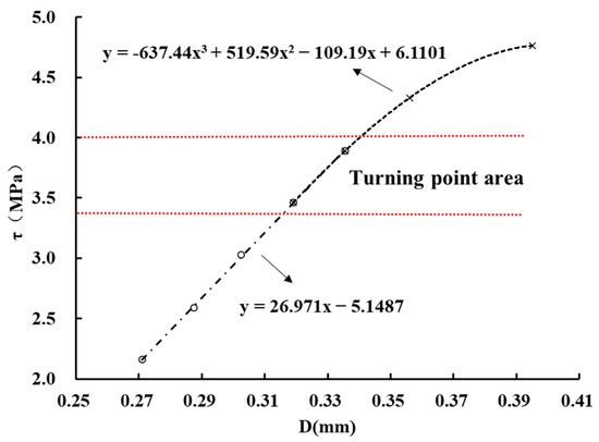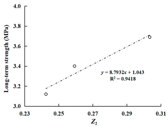 Based on the previous analysis, the determination of inflection points is critical to obtaining the long-term strength. According to the Levenberg–Marquardt algorithm method [29], the linear section and non-linear section of the iso-creep rate curve were fitted, respectively, as shown in Figure 11. The inflection point was determined by the minimum slope difference between the linear section and non-linear section at the inflection point. In the same way, the inflection points of other iso-creep rate curves can be determined and the long-term strength is the average value of the inflection points of five iso-creep rate curves. Thus, the long-term strengths of three samples were obtained by the iso-creep rate curve method and listed in Table 2. It can be found that the long-term strengths obtained by the transition creep method and the inflection point method are consistent, and the inflection point method has better reliability in determining long-term strength. Figure 12 shows the relationship between the long-term strength and the 3D morphological parameter (). The long-term strength increases with the increase of , and shows a linear trend.