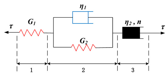 Resulting from the characteristics of the creep curves in this study, an improved model considering damage mechanics can be proposed based on the non-linear Burgers model proposed by Zhang et al. [8]. Figure 13 shows the non-linear Burgers model, the third part of which is the non-linear flow component. According to the non-linear Burgers model and initial condition, the creep equation from the rheological constitutive equation can be obtained as follows: