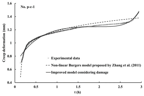 where b refers to a constant related to the discontinuity material, which is greater than 0. When t = 0, D = 0; when t = tb, D = 1, of which tb refers to the time that the sample is damaged. Based on the non-linear Burgers model, the damage variable was introduced to express the stress of the second part (see Figure 12), that is, was replaced by in the equation under the initial condition that t = 0 and . Therefore, the creep equation considering damage can be written as: