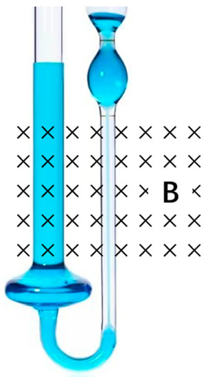 Referring to McTague et al. [20], a testing device for determining the variation of the viscosity in the applied magnetic field with different magnetic flux density was set up as shown in Figure 1. In Figure 1, the capillary tube is put in an external magnetic field, which is generated by the excitation coil. A maximum magnetic flux density of 2305 GS can be achieved. By measuring the time required for a certain volume of fluid to flow through the capillary under its own gravity, the kinematic viscosity (η), which is used to evaluate the fluidity of flowable tritium breeder, is calculated from Equation (1) [21]: