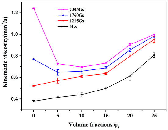 Relationship between magnetic fluid pressure drop and kinematic viscosity η under different volume fractions.