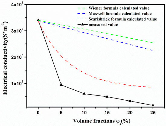 Figure 5 presents the calculated and experimental conductivity values according to Formulas (4)–(6). It indicates that the conductivity of the composite decreases with the increase of ceramic micro-powders fractions although the calculated values are greater than the measured ones. Formulas (4) and (5) are applied to the case where dispersed insulating particles are added into the conductive matrix, and Formula (6) is mainly applied to the case where conductive particles are added to the insulating matrix. However, all of above formulas are mainly concerned with the cases where the addition of the second particle is in low volume fraction.