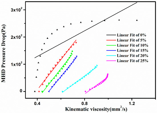 The relationship between and of the volume fraction of different ceramic micro-powders is shown in Figure 6. As can be seen from Figure 6, the MHD pressure drop of pure liquid metal is significantly greater than that of the fluid composites. The addition of Li2TiO3 micro-powder does reduce the MHD pressure drop, and Figure 5 shows that to reduce the conductivity leads to the MHD pressure drop. With the increase of Li2TiO3 micro-powder, the maximum MHD pressure drop of different volumes of powder decreases gradually. In order to further reveal the relationship between the MHD pressure drop and kinematic viscosity , the curves of the MHD pressure drop versus the kinematic viscosity were fitted. The fitting results are found to conform to the fitting formula: