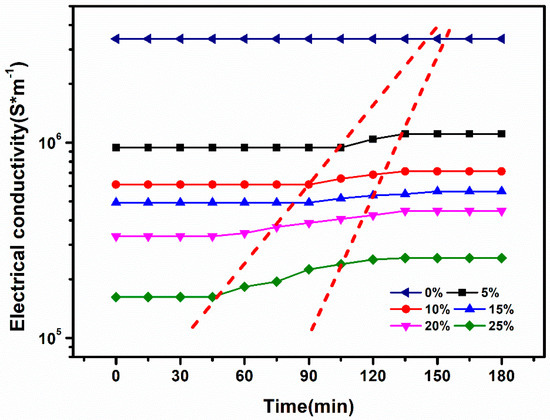 Considering that the prepared tritium breeder is composed of liquid GaInSn alloy and ceramic Li2TiO3 micro-powders, ceramic particles flowing onto the surface may occur during holding. In this point of view, the variation of the conductivity with time is used as the criterion to judge the stability of the dispersion uniformity. If the conductivity of the fluid remains unchanged with time, obviously, it is indicated that the fluid can be seen as in a stable state. On the contrary, if the conductivity changes with time, then it is considered that ceramic particles flowing onto the surface has occurred. Figure 7 shows the variation of the conductivity of the composite with holding time. When is 0, no obvious change of the conductivity can be found, indicating the considerably high stability of the liquid tritium. When is 5 Vol.%, the conductivity remains stable within the first 105 min and achieves a stable state after increasing to a certain extent. The above results indicate that the micro-powders can maintain a good mixing state with the liquid metal within 105 min. After that, there are ceramic particles flowing onto the surface, which then continues to maintain a stable state, indicating that a small amount of micro-powders precipitated, but the remaining micro-powders can still maintain a good mixing state with the liquid metal. When volume fraction continued to increase to 20 Vol.%, the conductivity remained stable for a certain period of time, and then, after a certain period of time, the conductivity remained unchanged, indicating that there is a certain amount of powder flowing onto the surface. Increasing the to 25 Vol.%, it was found that the conductivity increases significantly after maintaining for the first 45 min and then remains stable, indicating that as the volume fraction of added micro-powders is achieved to a certain extent, the mixed liquid becomes unstable. Interestingly, once the mixed materials are stirred by ultrasonic treatment, it can reach the suspended state again and achieve the initial conductivity, indicating a recycling use in practical application.