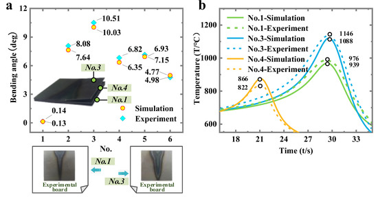 Comparison of results and the processed plate: (a) bending angle and (b) temperature peak.