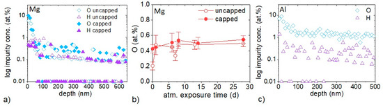 Furthermore, the depth profile of uncapped Al film after 87 days of atmosphere exposure (Figure 1c) demonstrates O and H uptakes averaged over a depth range of 100 to 500 nm of 1.4 ± 0.1 and 0.2 ± 0.1 at %, respectively and hence, significantly higher impurity concentrations than measured for the uncapped Mg, see Figure 1a. Therefore, Mg thin films deposited at 100 °C, see Figure 1a, provide a more efficient surface passivation than Al thin films deposited at 100 °C, see Figure 1c.