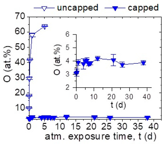 Here, Mg, Al, and Ca were synthesized at 100 °C and subsequently exposed to atmosphere without capping. O incorporation has been monitored by measuring the O concentration repeatedly by EDX after atmosphere exposure of up to 29 days, see Figure 4. The inset shows impurity concentrations in Mg and Al thin films for longer exposure times.