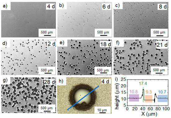 SEM images of Al-capped Ca deposited at 100 °C after exposure times (expressed in days (d)) of (a) 4 d, (b) 6 d, (c) 8 d, (d) 12 d, (e) 18 d, (f) 21 d, and (g) 28 d. (h) LOM image of a representative surface feature with 150X magnification after exposure time of 4 d. (i) LOM height profile across the surface feature in the capped Ca along the blue line depicted in h. The values indicate averaged heights of the marked sections according to the LOM coordinates in µm. The ridge height (at the crater edge) is around 8 μm with respect to the substrate (the middle part of the crater marked as orange).