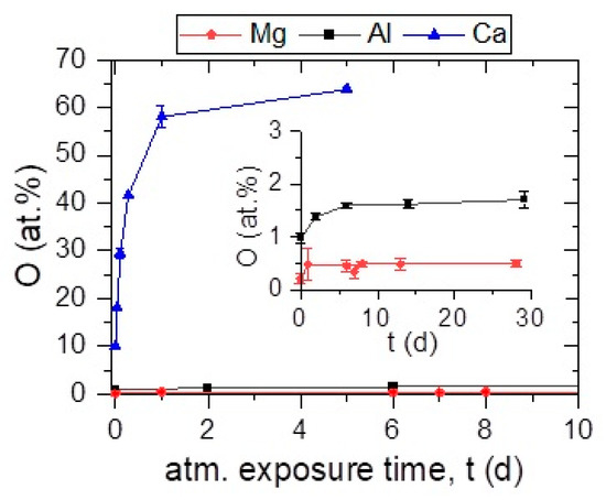 As discussed before, in the as-deposited state, which corresponds to an air exposure time of ≤3 min required by the transport of the sample from the deposition chamber to the measurement device, Ca exhibited an O concentration of 10.0 ± 0.4 at % while a concentration of 0.2 ± 0.1 and 1.0 ± 0.1 at % was measured for Mg, and Al, respectively.