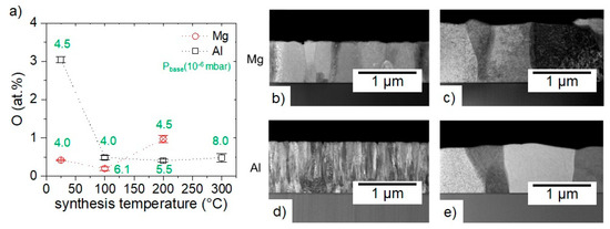 (a) O concentrations measured by EDX as a function of synthesis temperature for Mg and Al films in the as-deposited state (minimized air exposure time of ≤3 min). The red x marks the synthesis temperature where partial desorption of Mg is observed. The green values indicate the base pressure (Pbase) at synthesis temperature before deposition. STEM images of Mg synthesized at (b) RT and (c) 100 °C; Al synthesized at (d) RT and (e) 200 °C.