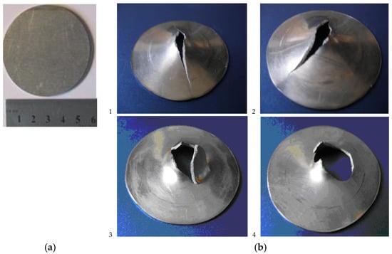 The research results in this work showed that the spatial distribution of damage and crack shapes in a thin sheet of titanium alloy during stamping are significantly affected by the speed of the punch. The change in the geometry of cracks in the range of punch speeds from 0.0003 to 15 m/s can be seen in the photograph of the samples after testing in Figure 1b. Mayer and Pursche [] noted that the samples actually exhibit a biaxial stress–strain state when testing for punching. There are three types of failure under the specified loading conditions: normal, radial, or ring failure. Radial cracks form under conditions of low plasticity of the material. A combination of radial cracks and bands of radial-circumferential shear are observed at high-stressed states. Many annular cracks and many bands of radial and circumferential shear are formed at low plasticity of the material. The observed changes in the geometric parameters of the resulting cracks are consistent with the data obtained on the increase in the flow stress and tensile strength with an increase in punch speed.