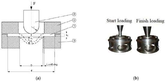 (a) The sectional scheme of punch test setup: 1—specimen; 2—hemispherical punch; 3, 4 are the lower and the upper parts of the support matrix, respectively; (b) Photos of punch positions at the start and end of the punching test process at Instron VHS 40/50-20 servo-hydraulic bench.