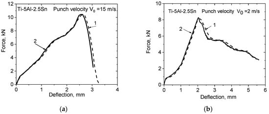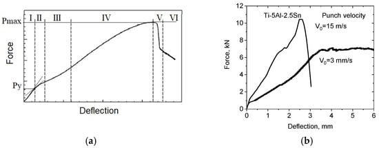 The resultant F(uz) force diagrams of resistance to penetration of a hemispherical punch from its movement indicate ductile fracture at punch speeds up to 15 m/s. The results indicate no embrittlement of the Ti-5Al-2.5Sn alpha titanium alloy under high-speed punching conditions. The formation of cracks was preceded by significant plastic deformation. Note that the general behavior of the punching force versus deflection is preserved, as shown in Figure 3a.