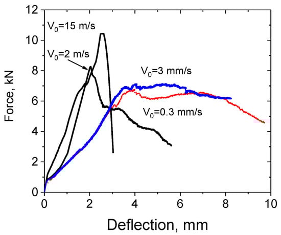Titanium plates were tested at punch speeds of 0.0003, 0.003, 2, and 15 m/s on an Instron VHS 40/50-20 servo-hydraulic bench. Experimental F(uz) diagrams are shown in Figure 5.