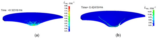 (a) Calculated distribution of effective strain rates in the cross section of punched Ti-5Al-2.5Sn plate at the time of 0.32319 ms and (b) at the time of 0.42419 ms. The velocity of the punch is 15 m/s.
