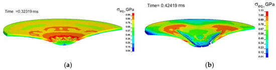 (a) Calculated distribution of equivalent stress in the cross-section of a punched Ti-5Al-2.5Sn plate at the time of 0.32319 ms and (b) at the time of 0.42419 ms. The velocity of the punch is 15 m/s.