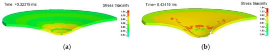 (a) Calculated distribution of stress triaxiality parameter in the cross-section of a punched Ti-5Al-2.5Sn plate at the time of 0.32319 ms and (b) at the time of 0.42419 ms. The velocity of the punch is 15 m/s.