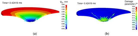 (a) Calculated distribution of displacements uz in the cross-section of a punched Ti-5Al-2.5Sn plate at the time of 0.42419 ms; (b) is the distribution of the damage parameter in the cross-section of a punched plate. The velocity of the punch is 15 m/s.