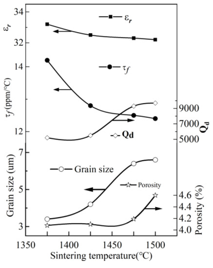 - Ioachim, A.; Toacsan, M.I.; Banciu, M.G. Effect of the sintering temperature on the Ba(Zn1/3Ta2/3)O3 dielectric properties. J. Eur. Ceram. Soc. 2007, 27, 1117–1122. [Google Scholar] [CrossRef]