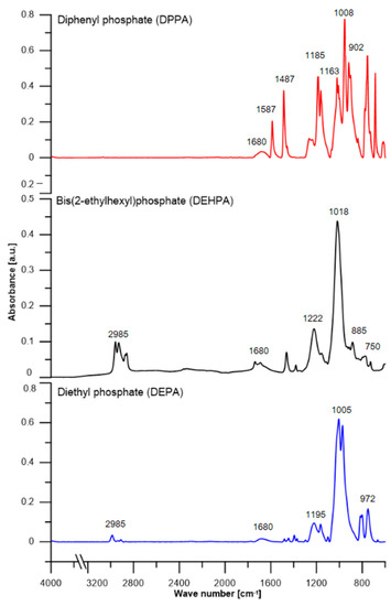 Figure 3 shows ATR-FT/IR spectra of classical absorption bands described in the literature. For the bis(2-ethylhexyl)phosphate (DEHPA) spectrum, a wide band is observed with the maximum at 2958 cm−1 from stretching vibrations of carbon-hydrogen bonds presented in the aliphatic chains. Then, numerous absorption bands in the range of 1018 to 885 cm−1 are observed, which correspond to the absorption of C-C bonds in the aliphatic chain. Some signals around 750 cm−1 are derived from C-O bonds in the structure. The spectra of DEHPA and diethyl phosphate (DEPA) are similar, due to the presence of alkyl substituents in the structure. However, the aliphatic groups in the structure of DEPA give a smaller signal in the range of 2985–2911 cm−1, because less energy is absorbed by the bonds in the short carbon chain. In contrast, the spectrum of diphenyl phosphate shows characteristic signals from the aromatic ring: 1487 cm−1 from C-H and 1587 cm−1 from C=C, as only this one has aromatic rings present in its structure. In comparison with the literature, the following infrared absorption frequencies can be assigned to organophosphoric acids of the type (RO)2POOH, as follows: P=O, 1210–1250 cm–1; P-O-(H), 1000–1031 cm–1; P-O-(C), 987–1042 or 1015–1060 cm–1 when R is a methyl group [34]. Importantly, it was observed that the PO band usually appears as a doublet in the infrared spectrum [35]. On this approach, the following assignments can be established for neat DEPA (Table 2): P=O, 1195/1164 cm–1; P-O-(C), 1005 cm–1; P-O-(H), 972 cm–1. Whereas the FTIR absorption spectra of DEHPA and DEPA are comparable, the band associated with the P-O-(H) group that occurs at 972 cm−1 in DEPA is not present in the DEHPA spectra. Characteristic band arrangements for phosphorus atom bonds in the DEHPA spectrum are observed for the P-O: 1222/1157 cm–1 and P-O-(C), 1017 cm–1. Similarly, aromatic phosphoric acid exhibits characteristic bands for the (P=O) and (P-O) stretching vibrations which for DPPA are located at 1185/1163 and 902 cm–1, respectively. However, DEHPA, DEPA, and DPPA display broad bands at about 1680 cm–1 which are associated with the P-O-H group of the dimeric peak of a hydrogen bond. Furthermore, signals from C-O bonds can be detected in all spectra.