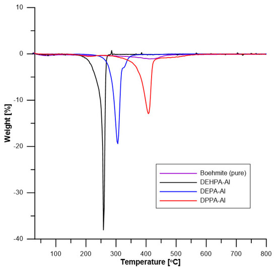 To assess fully the thermal properties of the DEPA-Al, DEHPA-Al, and DPPA-Al samples and pure boehmite, their thermal stability was also determined by thermogravimetric analysis. The data are summarized in Table 4 and Figure 6 and Figure 7.
