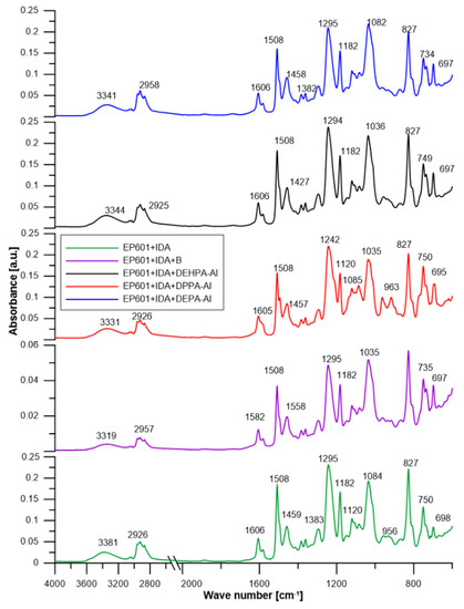 Figure 8 presents the spectra of obtained composites. Table 5 additionally includes the precise wavenumber values. In general, the spectra of all obtained composites follow a similar pattern. All composites have a detectable hydroxyl group range from 3319 to 3381 cm−1. The presence of -OH groups from Epidian 601 is confirmed by the large absorption band in the spectra. This signal becomes reduced in the modified composites. Stretching vibrations from the C-H aliphatic groups provide another unique absorption band in the 2958–2926 cm−1 region. This band can be observed in each composite. Single vibrations of C-H and C=C bonds related to benzene rings and aromatic skeletons can be correlated with single bands ranging from 1606 cm−1 to 1449 cm−1. They arise from both the aromatic epoxy resin component and diphenyl phosphate addition. Stretching vibrations of the C-O bond could be the cause of the bands of about 1182 cm−1. The signal about 800 cm−1 was similarly associated with aromatic C-C vibrations (Figure 8). In addition to epoxy resin signals, several particular signals detected in aluminium phosphates are present, confirming the presence of these ATHs in composites.