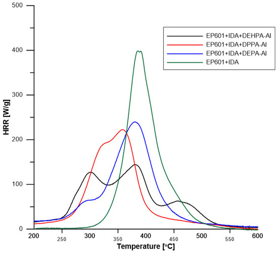 Decomposition is much more complex with hybrid with several peaks or shoulders to be observed. In all cases, the decomposition starts earlier (at around 250 °C). The main peak is strongly reduced in comparison to pure resin, i.e., 220–250 W/g and even 150 W/g for the composite containing DEHPA-Al. Residue content is low (around 10 wt%) because the content of boehmite (and then of mineral residue) is low in hybrids and char is not promoted as evidenced in TGA (residues are white). The heat of complete combustion is 22–24 kJ/g, lower than the value measured for epoxy because boehmite releases water, and organic fraction in hybrids releases less heat than epoxy. Indeed, considering that phosphorus is oxidized in P2O5, the heat of the complete combustion of phosphates ranges from 16.3 kJ/g (for DEPA) to 20 kJ/g (for DEHPA). THR is similar for the three composites containing hybrids, around 21 kJ/g.