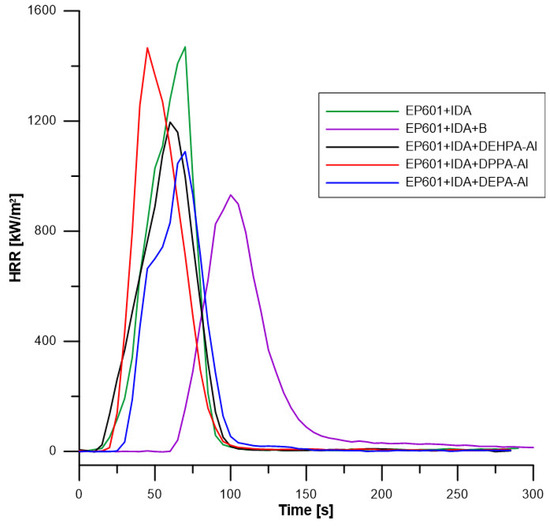 Figure 10 and Table 7 present results from the cone calorimetry test. Due to their small sizes, all the samples are thermally thin as described by Schartel et Hull [37]. After ignition, the heat release rate increases fast and continuously up to pHRR which is followed by a drastic decrease up to flame out (due to fuel depletion). TTI is 15 s for unfilled matrix and increases significantly for the composite filled with unmodified boehmite up to 64 s. This increase may be due to the release of water which slow downs the surface heating but may be also due to the fast accumulation of boehmites on the surface. In the case of composites filled with hybrids, TTI is much lower and in the same range as the unfilled matrix, probably because phosphorus compounds are released fast and contribute significantly to fuel production. These observations are in agreement with the low thermal stability of these composites observed in PCFC and with the low thermal stability of hybrids in TGA. Especially DEHPA contains a huge amount of carbon and hydrogen and its hybrid has the lowest thermal stability. Its incorporation leads to the lowest TTI and the highest EHC among the composites (close to the value for unfilled resin, −25.5 kJ/g which is typical for epoxy resins) [38].