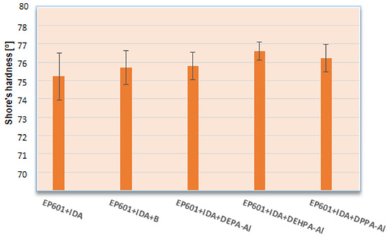 The Shore hardness values of the composites is presented on Figure 12. The pure composite without addition had the lowest Shore hardness (76.2° Sh). Analyzing the obtained results one can conclude that the addition of modified boehmites (APH) raises slightly the composite’s hardness by about 0.5–1.4° Sh. The little effect of fire retardant compound addition on the hardness of the composites is observed but it is also worth noting that pure boehmite also hardened the material. The range of this parameter for the materials was 0.6–1.4° Sh units in the D scale. According to the hardness tests it can be assumed that the modification type slightly contributes to the changing hardness of the obtained materials.