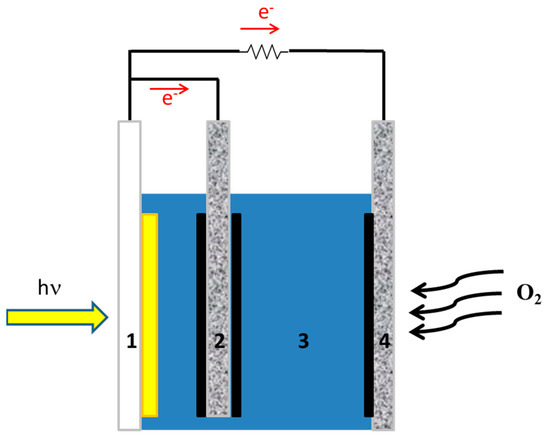 Illustration of the device with supercapacitor: (1) transparent FTO electrode carrying photocatalyst (yellow part); (2) supercapacitor electrode loaded with biochar (solid black); (3) electrolyte; (4) gas diffusion counter electrode carrying electrocatalyst (solid black).