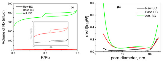 The activation of BC with KOH under pyrolysis is a process that combines high temperature with the influence of the base. Compared to BC pyrolyzed in the absence of KOH (raw BC) and BC treated with a basic solution under mild temperature (105 °C), there are significant differences in the physicochemical characteristics of the biochar. Almost all the applied physicochemical techniques exhibit these differences. This can be seen in Table 1, where the values of specific surface area (SSA), micropores SSA, pore volume, and point of zero charges are reported. The pyrolysis of the raw biomass produced biochar with a moderate SSA, a high amount of minerals, and a slightly basic surface. The surface groups were mainly oxygen-containing species, and the graphitic phase was not well detected. Treatment with a basic solution considerably increased the SSA and the surface basicity, while the activation of BC with the combined use of pyrolysis with KOH further increased the surface acidity and the SSA of the activated BC. The N2 adsorption-desorption isotherms of the samples are presented in Figure 2. It is seen that the amount of adsorbed N2 is by far higher in the activated BC. Interestingly, the type of the isotherm is not altered with any of the processes. The isotherm is typical of the IV types with an H4 hysteresis loop according to the IUPAC classification [19,20]. The high amount of adsorbed N2 in the very low p/Po values (about 250 mL g−1) is evidence of the high microporosity of the activated sample. Indeed, the micropores SSA was equal to 690 m2 g−1.