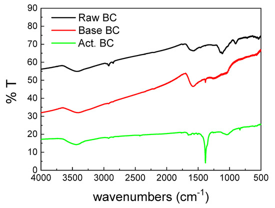 The FTIR spectra of the three BC samples (Figure 4) were also different. The main peak of the activated BC (Act.BC) is centered at 1383 cm−1 and corresponds to the carbonate species. This is expected as the result of the reactions presented in Equations (4) and (8). The formation of carbonates alters the spectrum of the Act. BC, while the other two spectra have similarities. This points out that pyrolysis is an important parameter for the differences observed between the three biochars. The carbonate species are absent in the raw BC, and only a small amount can be detected in the base-treated (base BC). This is probably due to the oxidation of the oxygen-containing groups during treatment. All the samples had a broad peak centered at about 3400 cm−1, which is due to the surface–OH groups or absorbed water molecules [21]. The double peak below 3000 cm−1 is higher in the raw BC. This peak is characteristic of the aliphatic H. This H is removed in the second treatment, and it is evidence that the treatment increases the graphitization of the BC.