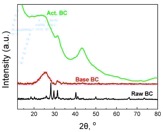 The XRD patterns of the BC are also informative. The patterns are presented in Figure 5. Raw BC exhibits many sharp peaks due to the high amount of minerals. The content of minerals was found to be 32% and consists mainly of Mg3(PO4)2, Ca3(PO4)2, and KCl [12,22]. During the treatment with a base solution at 105 °C, the majority of the minerals were removed from the biochar, and the amorphous graphitic phase could be then seen.