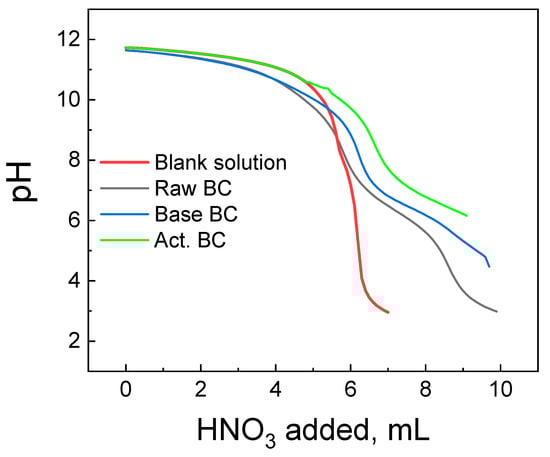 The titration curves of each BC studied are presented in Figure 6, with the corresponding titration curve of the blank solution. The blank solution is the solution of the indifferent electrolyte used without the addition of the BC. The raw BC and the Base Bc titration curves have a common section point with the curve of the blank solution at pH = 8.4 (Raw BC) and 9.6 (Base BC). This pH corresponds to the pzc of each material. The picture is slightly different for the activated BC. Its titration curve and the curve of the blank solution approach each other, and the section point is not clearly seen. This is due to the high basicity of the act. BC and its pzc are >10.5 of any, above the detection limit of the Potentiometric Mass Titration technique [27].