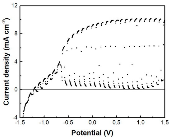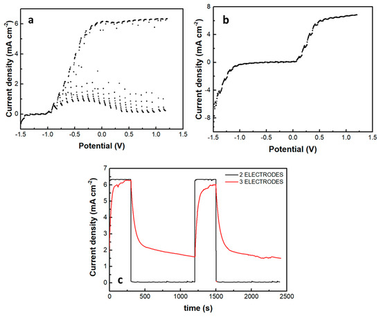 A photoelectrochemical cell has been made, and its current-voltage characteristics were first studied in the absence of the supercapacitor electrode. The cell consisted of a photoanode, a CB/CC cathode (i.e., a carbon cloth loaded with carbon black), and an aqueous NaOH electrolyte containing 10 v% EtOH. Figure 7a shows a linear sweep voltammetry curve recorded in the light chopping mode to reveal the conditions of photocurrent production. Indeed, photocurrent was produced in the voltage range above −1 V. The short-circuit current density was a bit larger than 6 mA cm−2. This is normal behavior for a photoelectrochemical cell functioning with a CdS/TiO2 photoanode [20]. The fact that it produces current without bias makes it a Photocatalytic Fuel Cell (PFC) with the above characteristics. In the voltage range approximately between −1 and +0.2 V, there is a dark current which is due to the adsorption of cations into the titania mesoporous structure, i.e., it is a capacitance current which is always observed with a photoanode based on mesoporous TiO2 [28]. Having thus defined the conditions for photocurrent production, we introduced the third (supercapacitor) electrode, short-circuited with the anode electrode and immersed in the same electrolyte, as illustrated in Figure 1. The current-voltage characteristics of this modified cell are shown in Figure 7b, again recorded in the light chopping mode. The aspect of the corresponding curve was now very different. Each chopping period lasted 20 s, i.e., 10 s light and 10 s dark. However, the current now did not go to zero in the dark, obviously, because the supercapacitor was charged and preserved current during the dark. Indeed, if the chopping period is made longer, as in Figure 7c, the current decay can be observed in the dark. In the absence of a supercapacitor, when the light was turned off, the current became fast zero. In the presence of the supercapacitor, as soon as the light was turned off, the current decayed and never became zero in the measurement range of 15 min. obviously, this combination of the three electrodes, photoanode, cathode, and supercapacitor can convert light energy into electricity and store it by exploiting its supercapacitor functionality.