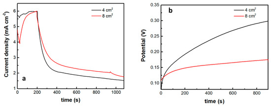 The introduction of the supercapacitor electrode and its short-circuiting with the photoanode had a rather dramatic effect on photocurrent onset, as seen in Figure 7b. Practically this means a reduction of the photocurrent flowing in the external circuit, which is expected since the charge carriers are consumed to charge the supercapacitor. Of course, the supercapacitor charging rate will depend on the ratio between the photoanode photocurrent generation capability and the capacitance of the supercapacitor. The specific capacitance of the electrodes made by the presently activated biochar was 98 F g−1. Since the quantity of BC was 15 mg for an electrode of the active area of 1 cm2, the capacitance of such electrode was 1.47 F. Figure 8 shows discharging and charging processes for two supercapacitor electrodes, one of 4 cm2 and the second of 8 cm2 active area, obviously, possessing a capacitance of 4 × 1.47 = 5.88 F and 8 × 1.47 = 11.76 F, respectively. As expected, it takes more time to discharge and much more time to charge a larger capacitor under the same conditions. Therefore, the efficiency of charging or discharging conditions in the above cell will be a function of the relative photoanode and supercapacitor capabilities.