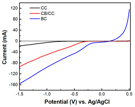 Linear sweep voltammetry curves were recorded with three different samples as working electrodes: CC carbon cloth, CB/CC carbon black on carbon cloth, and BC biochar on carbon cloth. A Pt wire was used as a counter and Ag/AgCl as a reference electrode. The electrolyte was 0.5 M aqueous NaOH.