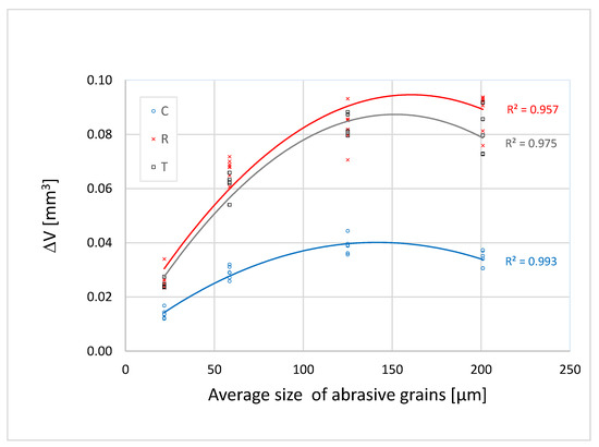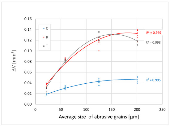 Figure 5, Figure 6 and Figure 7 show that the abrasion volume loss of all the samples and on all sections grows simultaneously with the growth of the grains, up to a certain point. After that point, in most of the tested samples, there occurs a decrease in the abrasion volume loss despite the increase in the average size of the abrasive grains. This phenomenon is called a critical abrasive grain size and is also observed in metallic and other non-metallic engineering materials [27,28,29,30]. The values of the critical abrasive grain size are between 125 µm and 200 µm, which coincides with the range of values of the trachea diameter of the test samples (Figure 2). Ohtani and Kamasaki [19] observed this effect in different types of angiosperm plants; a high positive correlation between the trachea size and that of the abrasive grains was noted. The correlation between the pore size and the critical abrasive grain size is of key importance for the abrasive wear rate. This statement is supported by the results of research carried out on compressed sugi wood [18], where the study showed that by reducing porosity in compressed wood, the grit size effect is gradually lost.