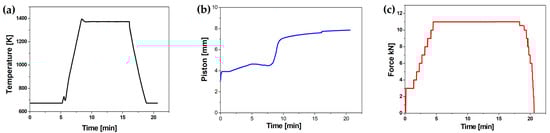 Actual (a) temperature–time, (b) displacement–time, and (c) pressure–time curves registered during the SPS process.