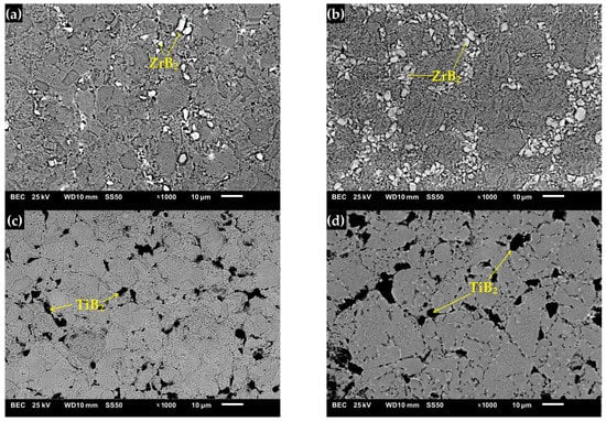 The SEM micrograph of the composites with: (a) 5% ZrB2, (b) 10% ZrB2, (c) 5% TiB2, and (d) 10% TiB2.